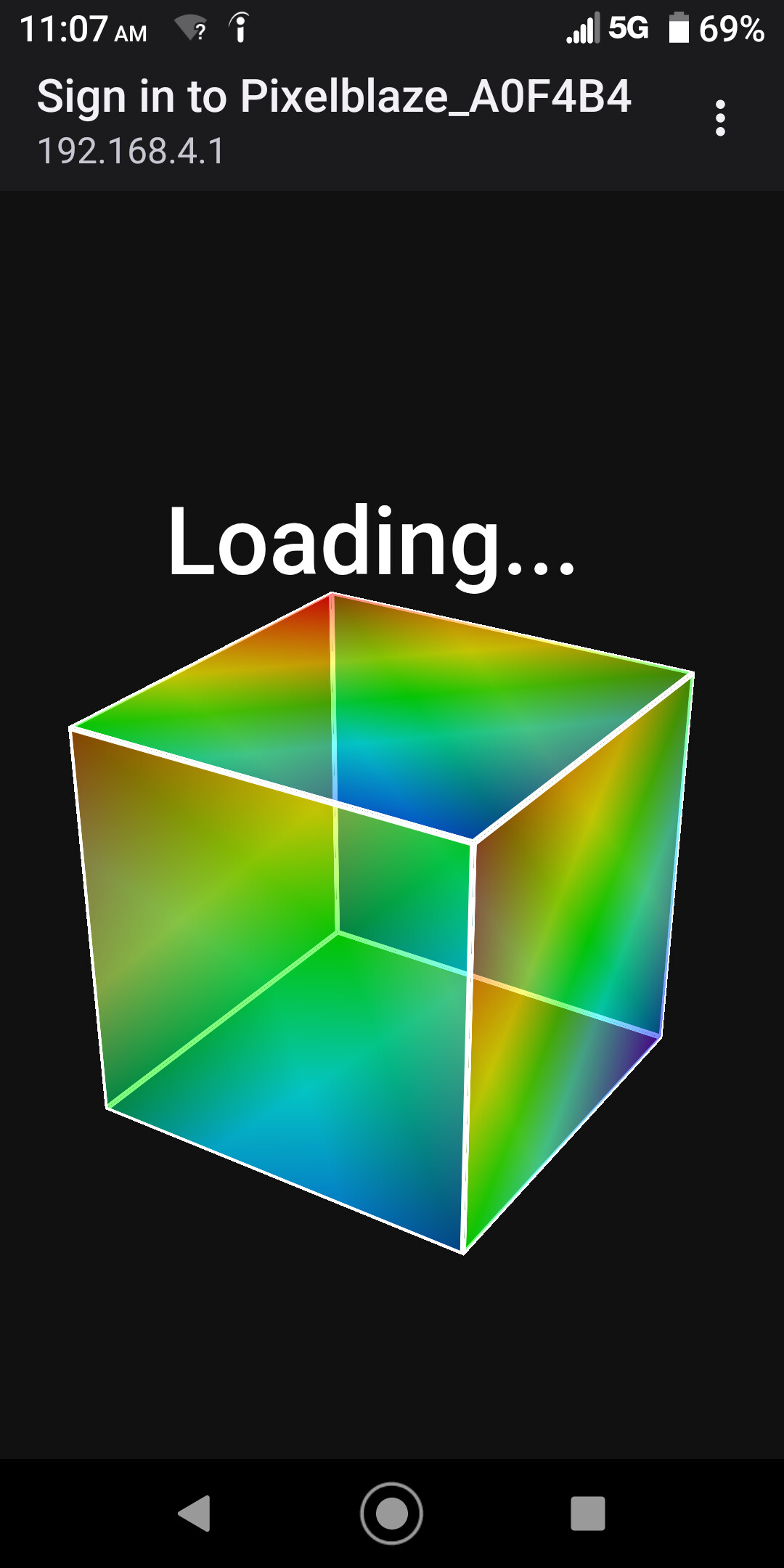 Connect to the Pixelblaze_XXXXXX network, dismiss the stuck spinning cube modal (check in the dots menu on the top right), but stay connected to itās wifi network. Load up a browser and get to the recovery tool: