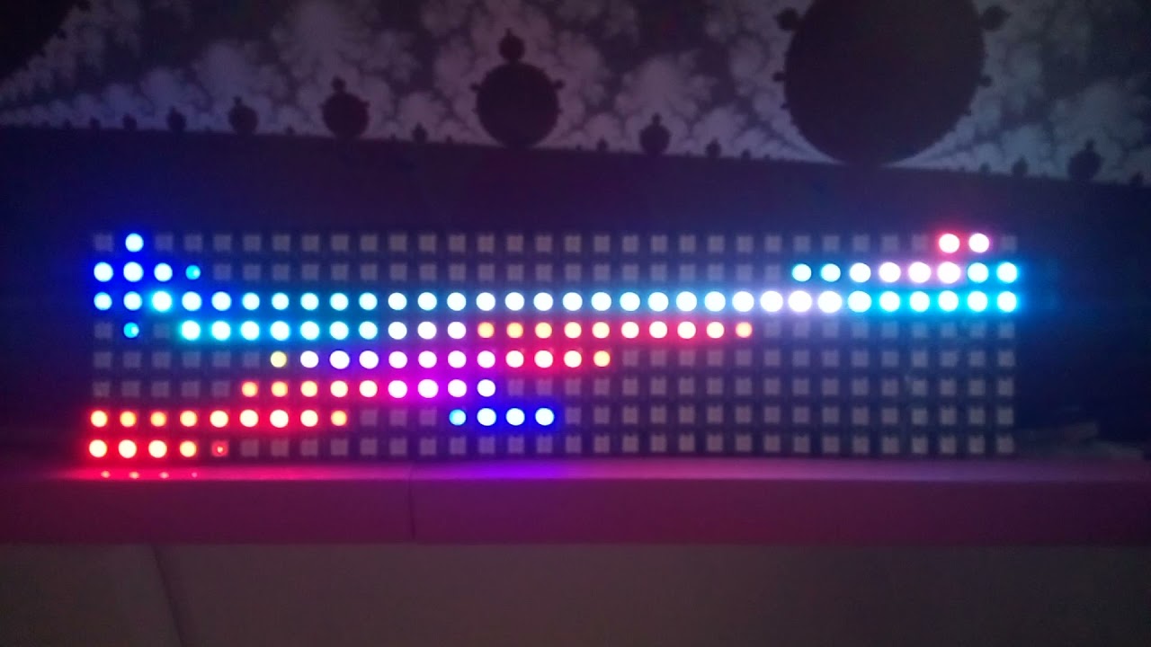 The one thing I am still trying to get right is the gamma of the antialiased pixels. These WS2812 LEDs are eye-searingly bright so when I turn them down to a safe level I am down to only a few bits of color depth. I am thinking of pasting my own HSVtoRGB in here so that I can use v=a*a in PixelMax() instead of multiplying r,g,b separately but other ideas are of course most welcome!