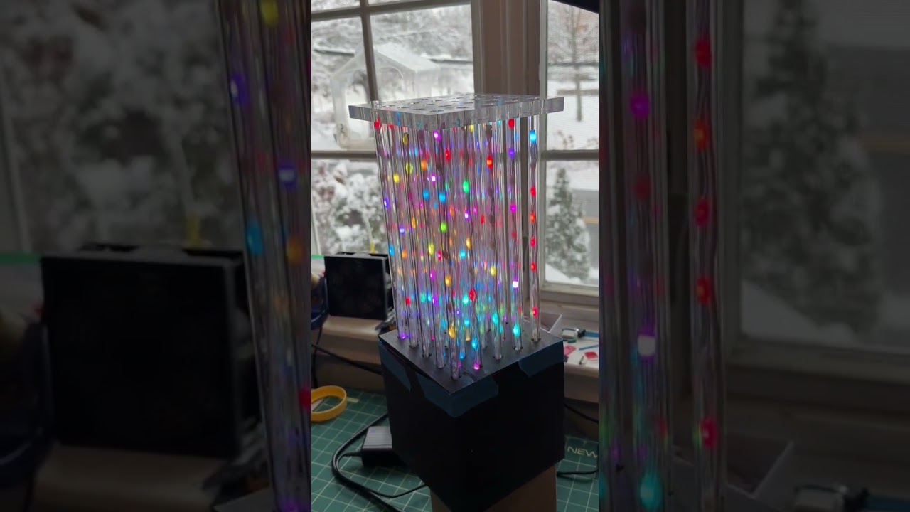 Pebble lights inside plexiglass tubes. plexiglass 1/4” top laser cut to hold the tubes. Laser cut and stained wooden base. Need to figure a good way to clasp shut the top, as I’ve had to rewire a couple times when students lifted it from the top & breadboard wires came undone. Hot glued the wires to the breadboard, but when I make a larger version I’ll definitely solder things in.