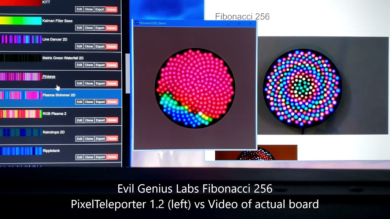 Here are a few relaxing minutes of the new Pixel Teleporter simulating the awesome Evil Genius Labs Fibonacci 256 board. It’s being driven live by a Pixelblaze3 using the mapping function developed in this thread. A video of an actual board from the Evil Genius website is shown at right for comparison.