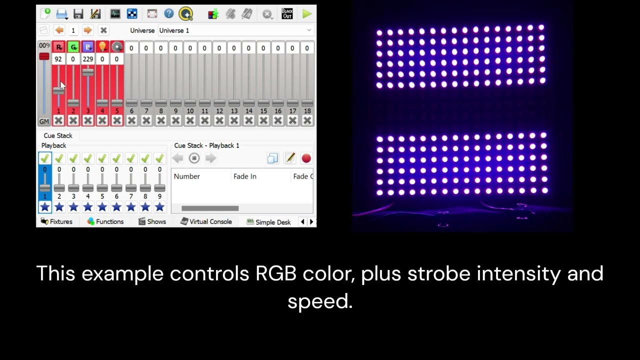 Or you can let the Pixelblaze be a Pixelblaze and run complex patterns while you choose color and/or palette via DMX channels. Or, with a little code added to your patterns, you can use DMX to select patterns from the playlist.