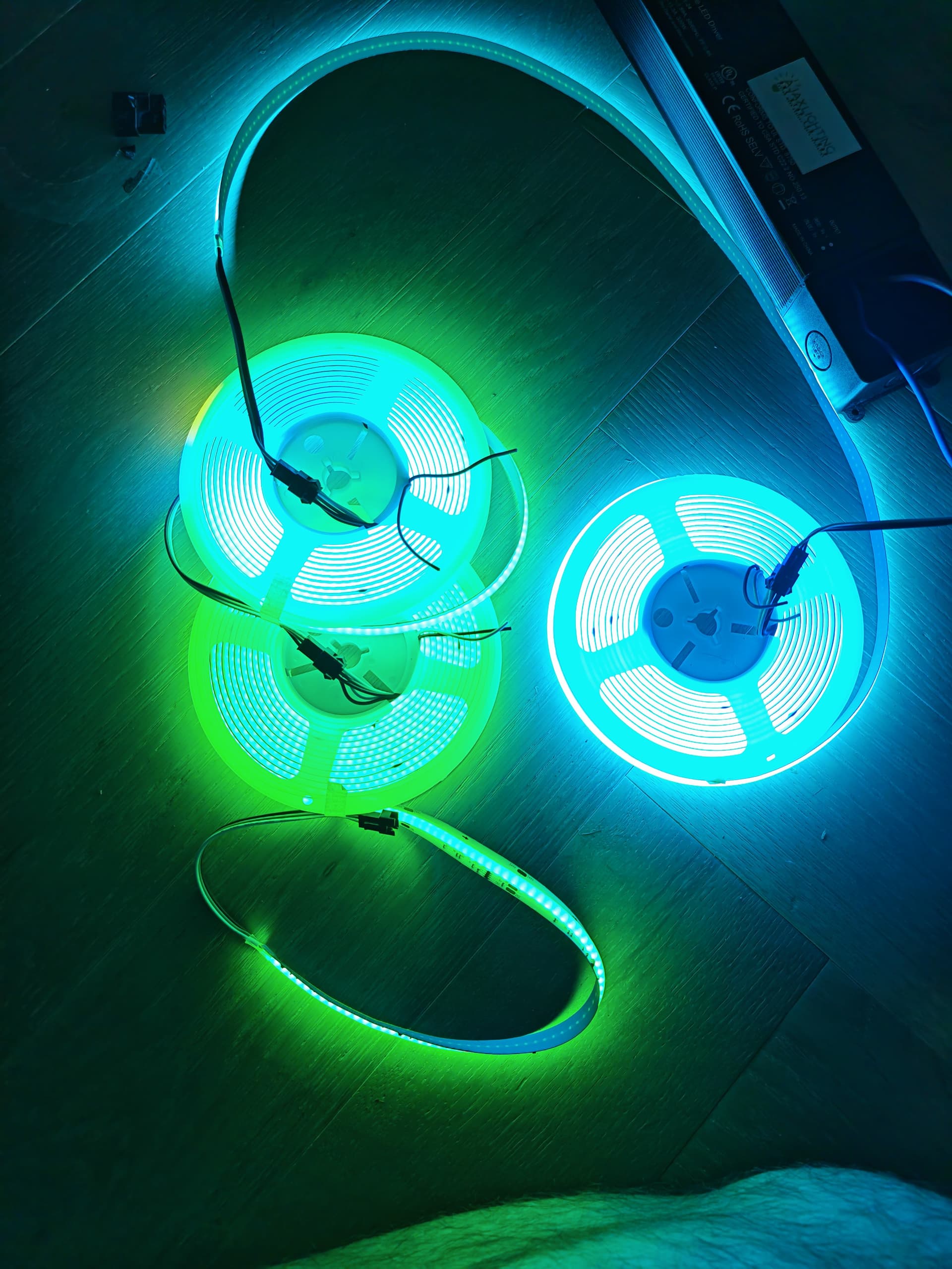 The setup is 24v led strips, 5m in each role, the intended color was blue, and you can see how it slowly turns green on the middle of 2nd roll.